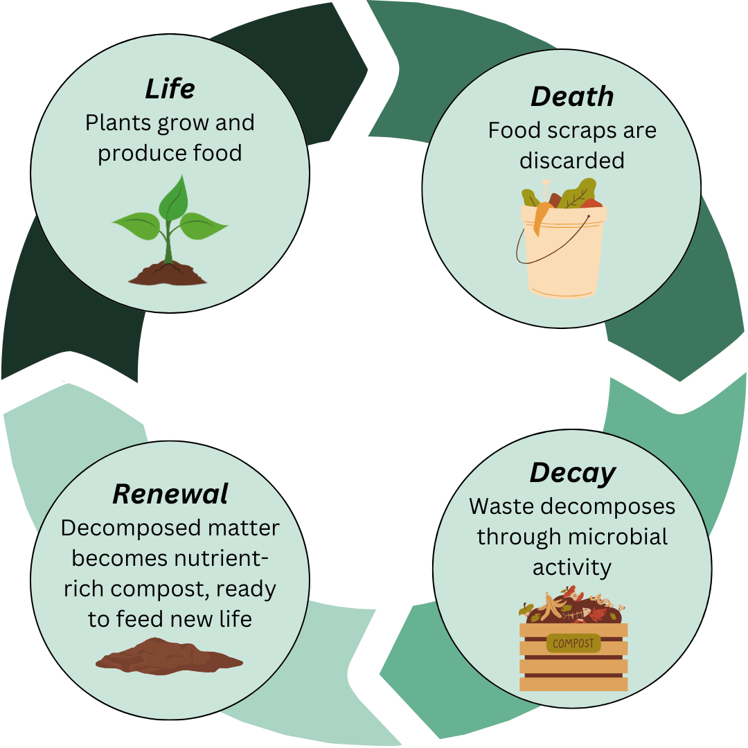 Composting turns food scraps, yard waste, and other organic material into nutrient-rich soil. It is an endlessly regenerative cycle that reduces waste, enriches soil, and nourishes new life (including our food!).