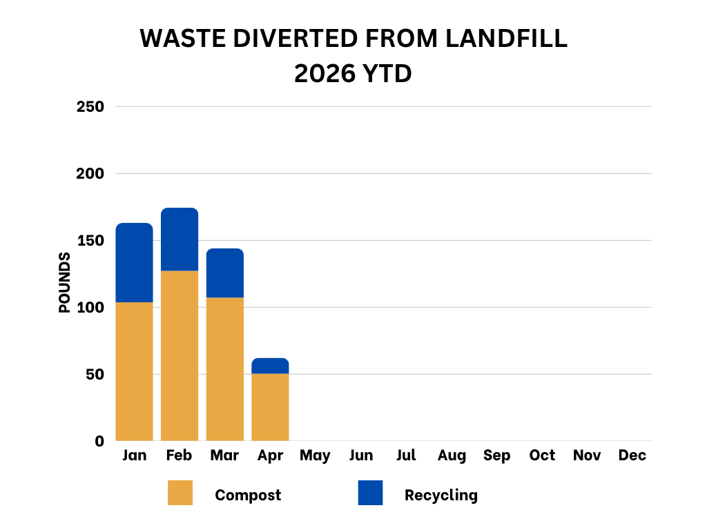 Compost is aggregated in a 64-gallon yellow rolling tote (you may notice it next to the dumpster screen) and collected curbside weekly via a commercial subscription to Compost Collective KC.